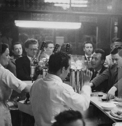 It was reportedly serving a thousand espressos a day before long. A 100,000 cappuccinos a year! Thanks to the romantic Italian vibe, the Gaggia's atmospheric blasts of steam filling the room, relentless gurgling and hissing that made excited crowds talk over the noise, and the kinetic energy of formally dressed Baristas pulling levers, taking orders, and juggling hot cups of espresso, it began a craze. The Moka Bar set off an explosion of imitators, with some 500 espresso bars in London alone, by 1960.